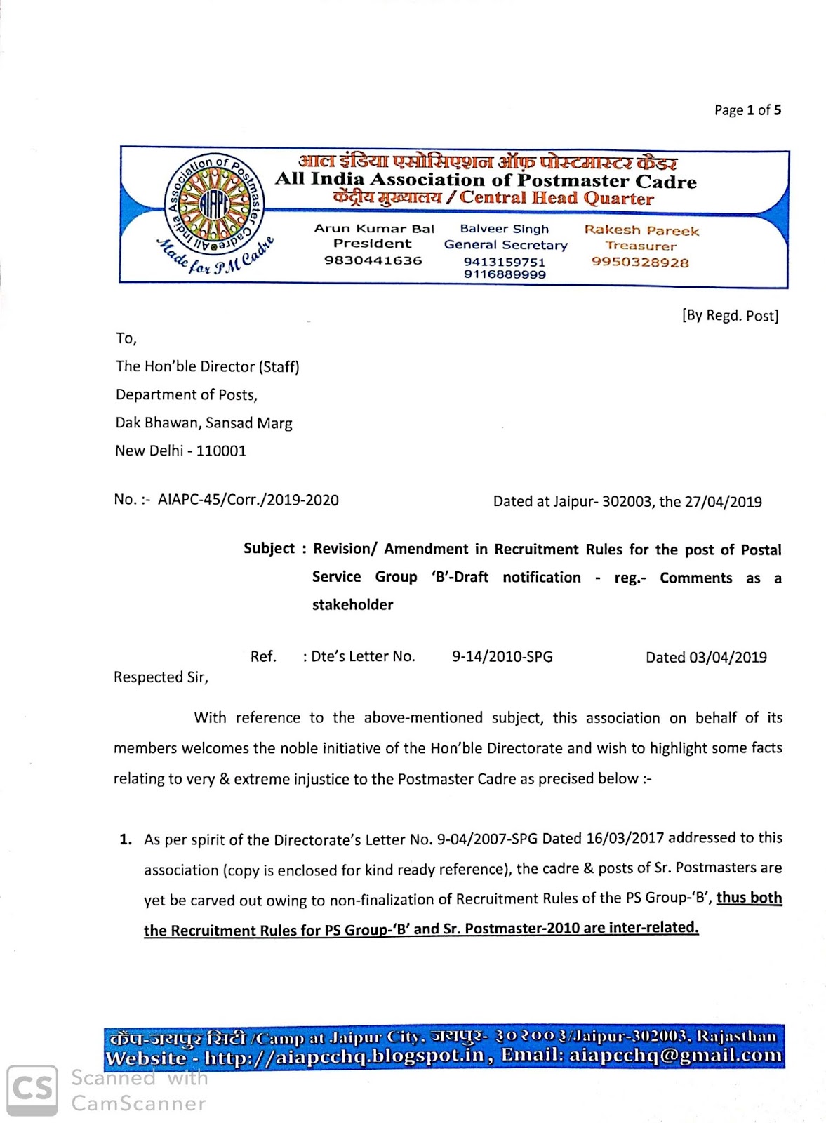 AIAPC writes to Directorate regarding Postmaster Cadre as eligible for IP LDCE